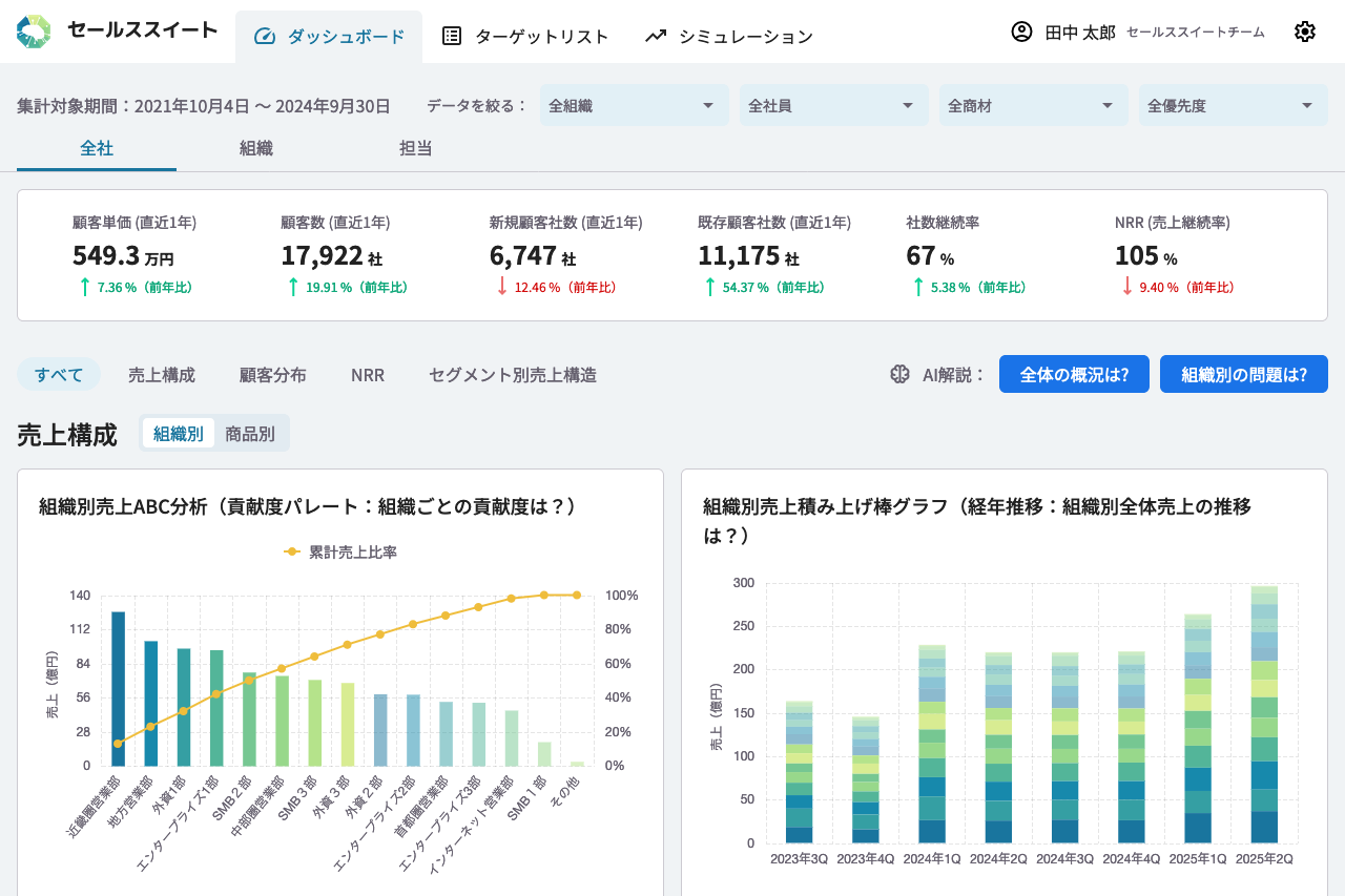 全社分析では、組織別の売上推移、累計売上額、比率を確認し、部署別の成長率や売上の差分も把握できます。さらに既存顧客のNRRの内訳と推移、新規・既存顧客の売上金額と比率の変動も確認可能です。また部署別の一人当たりの売上生産性も分析できます。これにより、各部署のパフォーマンス評価と効率改善のポイントが明確になり、NRR、アップセル、クロスセル、チャーン・ダウンセル率の把握を通じて、顧客維持の成功度を測定することができます。